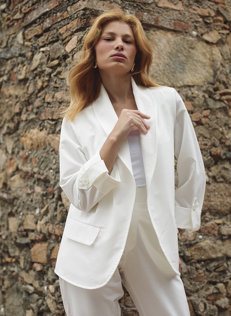 Confeccionado em tecido Twill de Alfaiataria: Material encorpado, com toque suave e estrutura que garante um caimento elegante, mantendo o blazer alinhado o dia todo.