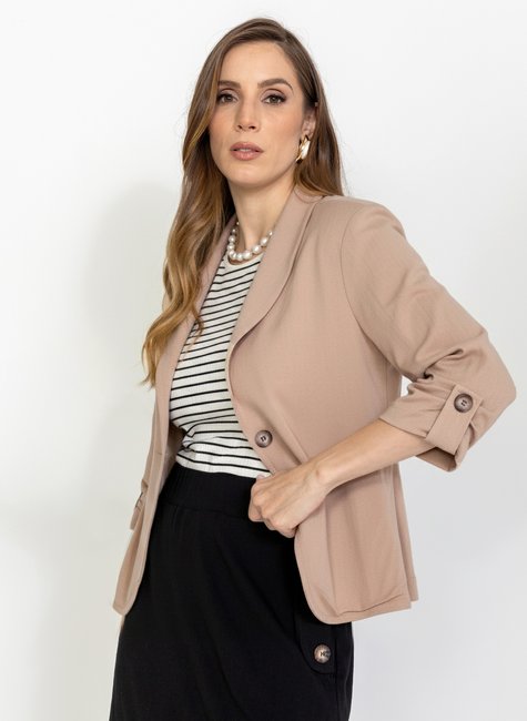 Blazer confeccionado em viscose flowing, um tecido levemente estruturado, que garante caimento impecável e conforto ao vestir. Possui mangas 3/4 com detalhe de lapela e botão, agregando sofisticação e acabamento refinado à peça.
