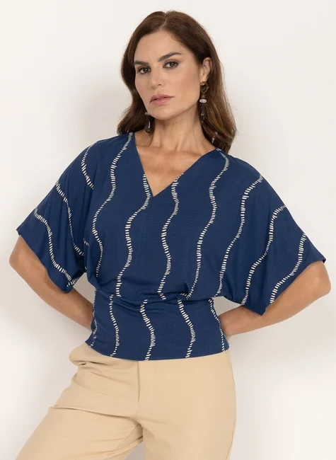 O destaque fica por conta das mangas amplas estilo morcego, com comprimento até a altura dos cotovelos, que proporcionam movimento e um visual moderno. O decote V mais profundo valoriza o colo com feminilidade, enquanto a barra ajustada na cintura define a silhueta e cria um contraste elegante com o volume da parte superior.