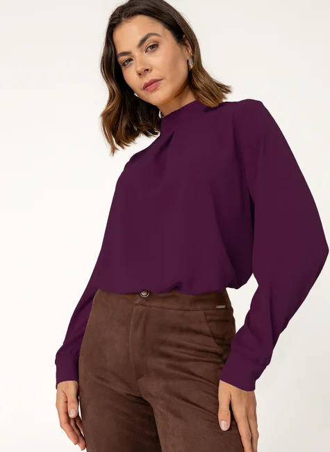 Blusa de manga longa com punhos finalizados em botão delicado. A gola alta apresenta prega fêmea e fechamento posterior por botões, garantindo um toque refinado e feminino. Modelagem leve e elegante, ideal para composições versáteis do dia à noite.