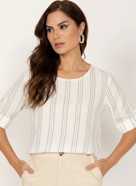 Blusa confeccionada em tecido de viscose com linho e modal, que oferece toque suave, leveza e respirabilidade, perfeita para os dias mais quentes. O modelo apresenta decote redondo e mangas curtas com detalhe de martingale, que adicionam um charme casual e moderno ao visual. O tecido listrado traz um toque de frescor e estilo, enquanto o caimento solto e o comprimento levemente mais curto garantem conforto e movimento.