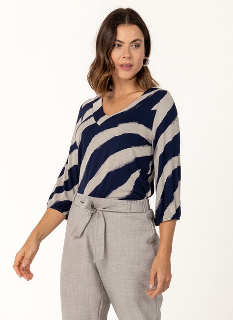 Blusa confeccionada em malha de viscose com estampa animal print em versão ampliada, que traz um toque moderno e sofisticado à peça. Possui decote em V com detalhe de pala, que valoriza o colo com elegância. As mangas 3/4 contam com elástico no punho, criando um leve efeito franzido, enquanto o caimento solto ao corpo garante conforto e fluidez. Uma escolha perfeita para compor looks cheios de estilo e personalidade.