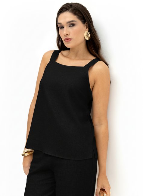 Blusa regata confeccionada em viscose com linho, unindo leveza, frescor e elegância em uma mesma peça. O modelo possui alças de 3,5 cm de largura e caimento solto ao corpo, proporcionando conforto e movimento natural.
