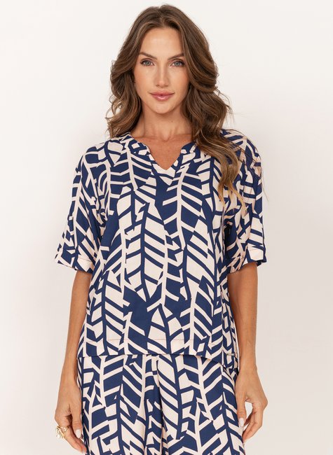 Blusa confeccionada em viscose, com caimento leve e solto que proporciona conforto e movimento ao vestir. O modelo apresenta mangas curtas e decote gola padre, que adiciona um toque moderno e elegante à peça. A estampa geométrica desconstruída traz personalidade e estilo, perfeita para compor produções sofisticadas e contemporâneas.