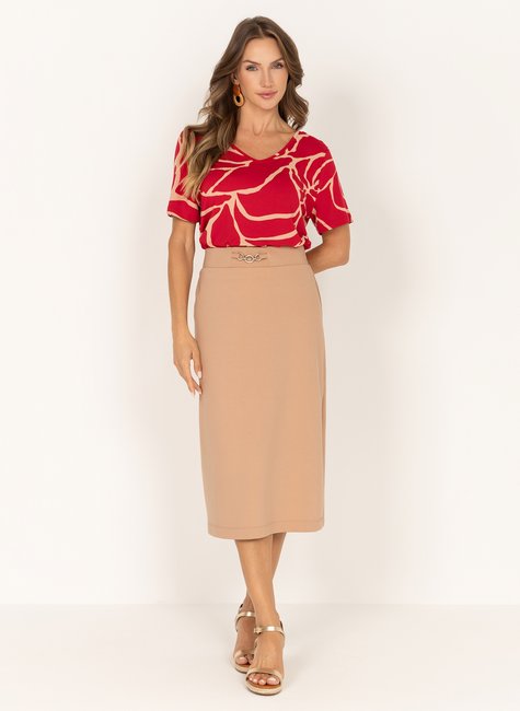 Saia confeccionada em malha strong, tecido conhecido pela estrutura firme e ótimo caimento. O modelo possui comprimento midi e modelagem reta, que valoriza a silhueta com elegância e conforto. O cós é largo e apresenta um delicado detalhe metálico na parte frontal, acrescentando um toque sofisticado à peça. Versátil e atemporal, é uma excelente opção para compor looks refinados tanto para o dia quanto para a noite.