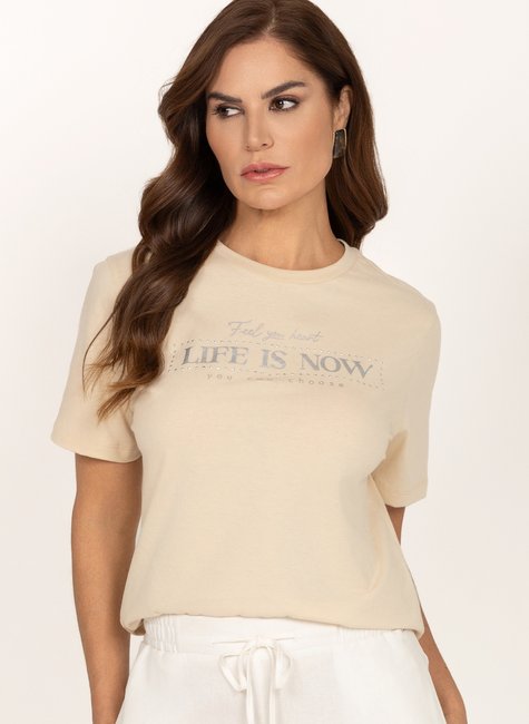 A peça ganha destaque com estampa localizada com escrita: “Feel your heart, life is now, you can choose”, que transmite uma mensagem inspiradora e cheia de significado. Tradução: “Sinta seu coração, a vida é agora, você pode escolher”. Perfeita para compor looks casuais com personalidade, combinando facilmente com jeans, saias ou peças mais confortáveis.