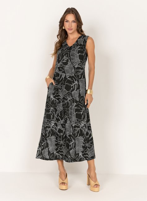 Vestido midi em 100% viscose, com caimento leve e toque macio, ideal para os dias quentes. O modelo é cavado, possui pregas nos ombros que valorizam o design, e conta com decote V, que alonga a silhueta. Sua modelagem é fluida e solta ao corpo, trazendo conforto e frescor ao vestir. Os bolsos frontais acrescentam praticidade ao look. A estampa apresenta fundo verde com folhagens brancas, criando um contraste harmonioso e cheio de personalidade. Uma peça versátil para aproveitar o verão com estilo. Combine com sandálias rasteiras para um visual despojado ou aposte em acessórios sofisticados e salto bloco para elevar a produção em ocasiões especiais.