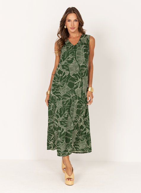 Vestido midi em 100% viscose, com caimento leve e toque macio, ideal para os dias quentes. O modelo é cavado, possui pregas nos ombros que valorizam o design, e conta com decote V, que alonga a silhueta. Sua modelagem é fluida e solta ao corpo, trazendo conforto e frescor ao vestir. Os bolsos frontais acrescentam praticidade ao look. A estampa apresenta fundo verde com folhagens brancas, criando um contraste harmonioso e cheio de personalidade. Uma peça versátil para aproveitar o verão com estilo. Combine com sandálias rasteiras para um visual despojado ou aposte em acessórios sofisticados e salto bloco para elevar a produção em ocasiões especiais.