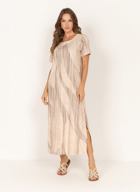 Confeccionado em crepe texturizado, este vestido midi traz leveza e sofisticação em uma modelagem solta que proporciona conforto e movimento. O design conta com mangas curtas, decote redondo clássico e fendas laterais que adicionam fluidez ao caminhar. O destaque fica por conta da estampa exclusiva de folhagens abstratas, que garante um visual moderno e elegante.