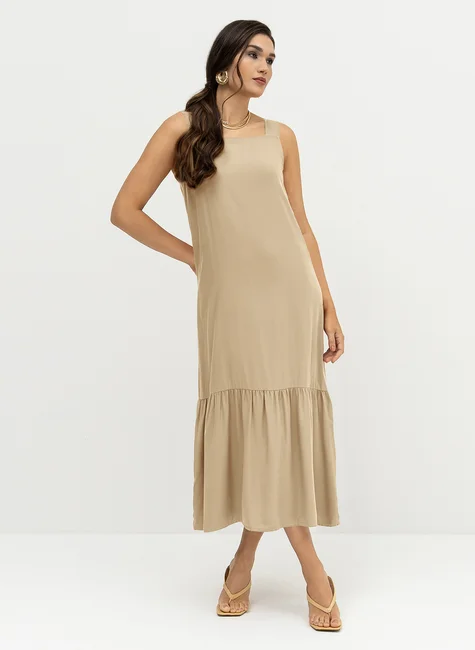 Possui decote reto e alças largas, que garantem melhor sustentação e um visual clean. O destaque da peça fica por conta da camada franzida na barra, com recorte estilo maria, que adiciona movimento, leveza e um toque feminino ao design.