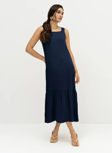 Possui decote reto e alças largas, que garantem melhor sustentação e um visual clean. O destaque da peça fica por conta da camada franzida na barra, com recorte estilo maria, que adiciona movimento, leveza e um toque feminino ao design.