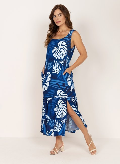 A estampa com folhagens evoca uma sensação de frescor e elegância inspirada na natureza. Possui decote discreto, alças largas confortáveis e um elegante comprimento mídi com uma fenda lateral, que adiciona charme e facilita o movimento.