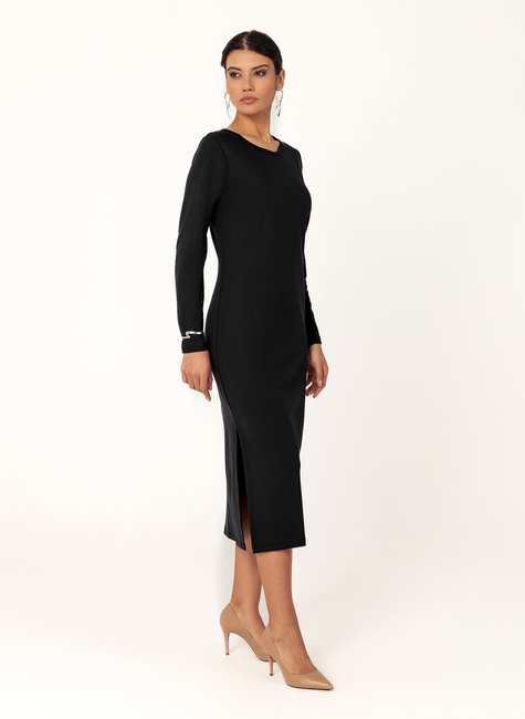 Vestido confeccionado em malha estruturada, com decote redondo e mangas longas que garantem sofisticação. O comprimento midi aliado à abertura lateral proporciona movimento elegante e moderno. Caimento impecável, ideal para composições formais ou casuais refinadas.