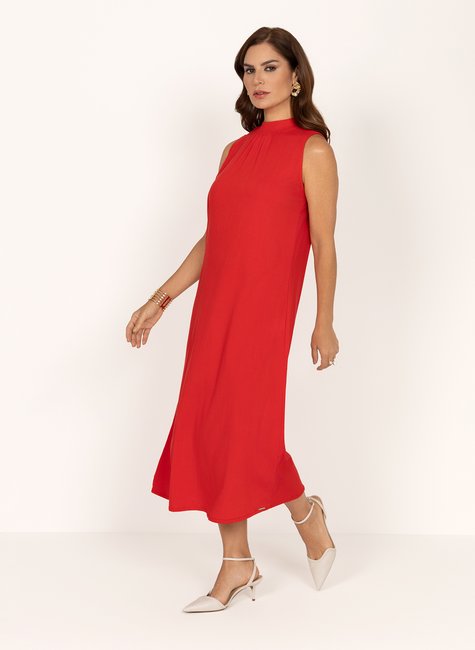 Vestido confeccionado em viscose Flowing, tecido leve, fluido e com toque macio, que proporciona conforto e elegância. O modelo possui comprimento midi, modelagem solta ao corpo e decote fechado com delicado franzido, criando um visual sofisticado e feminino. Sem mangas, valoriza os ombros e garante leveza ao look.