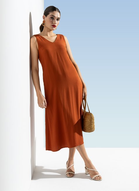 Sem mangas, o modelo cavado é perfeito para os dias mais quentes, e o charme extra fica por conta da fenda lateral esquerda de 32 cm, que adiciona modernidade e sofisticação ao visual.