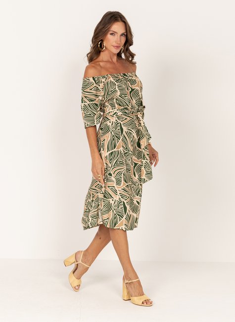 Vestido midi com estampa, perfeito para looks alegres e modernos. Confeccionado em tecido leve e fresco, possui decote arredondado e mangas curtas com leve volume, conferindo charme e feminilidade. A cintura é marcada com um cinto do mesmo tecido, permitindo uso opcional, ajuste personalizado e valorizando a silhueta. A saia tem caimento fluido e comprimento elegante, ideal para ocasiões casuais ou eventos diurnos. Um modelo versátil, que combina conforto e estilo em uma única peça.